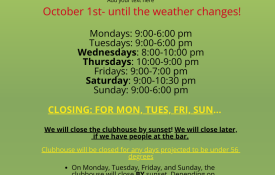 October Hours: Thing will changed based on attendence and weather. The Late evening golfing members should have a key to their shed if we are not here! Tee Times are encouraged for green fees and members at this time especially after 3pm! Let us know your coming with a group! Last cart rental tee time will be 5pm! Regular Hours: Monday, Tuesday, Sunday: 8 AM – 6PMWednesday – Saturday: 8 AM – 10 PMThursday: 10 AM – 8 PMFriday: 9 AM – 7PM Additional Notes: On Monday, Tuesday, Friday, and Sunday, the clubhouse will close BY sunset. Depending on attendence clubhouse will close between 5-7 Closing times may be extended if patrons are already at the bar. (this will be to the bartender on duty's discretion) The clubhouse will close on any day with projected temperatures below 56°F. Hours are subject to change and the clubhouse may close due to inclement weather. Planned events will take place as scheduled.